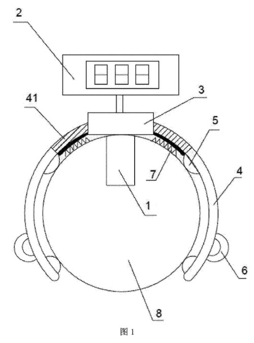 其中:1、電磁流量計(jì)本體,2、電磁流量計(jì)轉(zhuǎn)換器,3、鏈接基座,4、卡爪,5、凸點(diǎn),6、把手,7、限位彈簧,8、流體管,41、彈性層