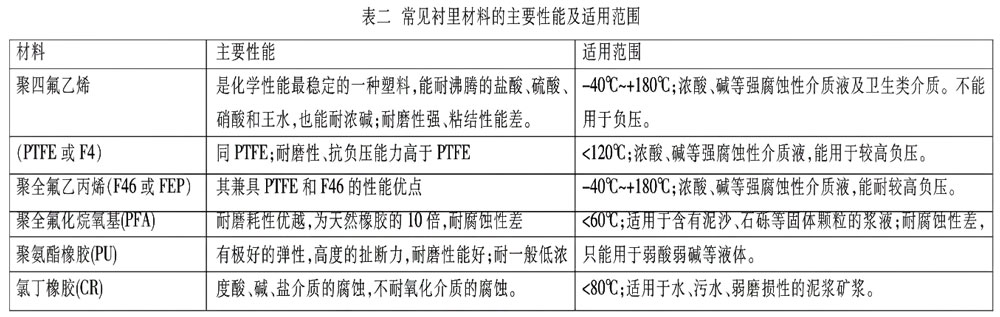 電磁流量計(jì)正常工作的基本條件之一,是測量管內(nèi)壁除電極處外,其它地方的法向電流為零。為滿足這一條件,zui簡單的方法是將導(dǎo)電的金屬測量管內(nèi)壁和法蘭端面襯以絕緣襯里。通俗地講,用絕緣襯里的目的是防止感應(yīng)信號(hào)電壓被金屬管短路,可見絕緣襯里在電磁流量計(jì)應(yīng)用中的作用十分重要。由于被測測導(dǎo)電介質(zhì)的流體種類繁多,它們的物理化學(xué)特性也不盡相同,不可能用一種絕緣材料的襯里來滿足所有應(yīng)用電磁流量計(jì)的測量流體介質(zhì)的物理化學(xué)特性要求;因此,在襯里材料的選型上,應(yīng)重點(diǎn)考慮測量介質(zhì)對襯里的耐溫度、熱沖擊、高壓、負(fù)壓、磨損、腐蝕、粘結(jié)、附著等方面的要求。下面通過圖表二的方式介紹常見的電磁流量計(jì)測量管襯里材料的主要性能特點(diǎn)及適用范圍。