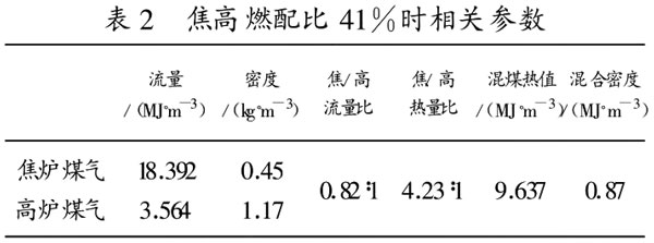 實(shí)際生產(chǎn)上采用的焦?fàn)t、高爐煤氣的配比為百分之四十一左右,有時(shí)甚至更低?,F(xiàn)以配比為百分之四十一為例,相關(guān)參數(shù)如表2。