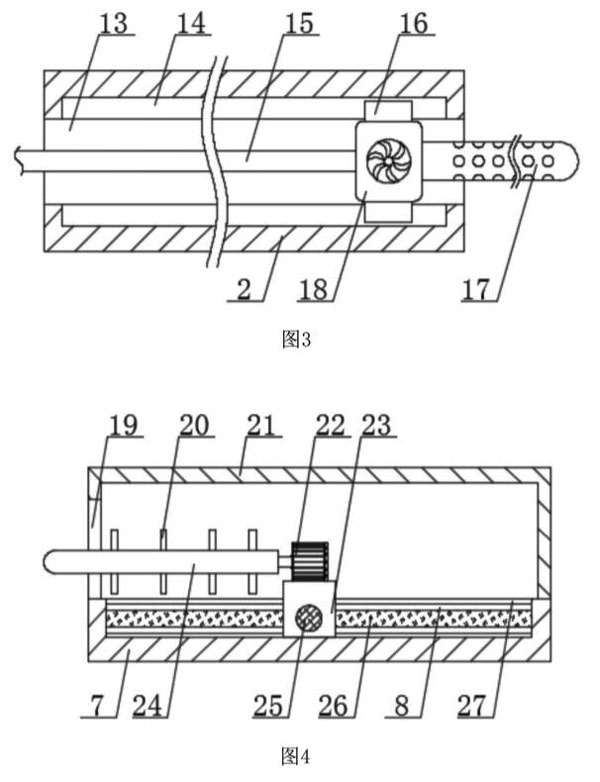 如圖1-5所示,在對(duì)電磁流量計(jì)本體6進(jìn)行清洗時(shí),通過電動(dòng)伸縮桿12推動(dòng)支撐板4向外移動(dòng),使電磁流量計(jì)本體6放置在定位弧形槽11上,使電動(dòng)伸縮桿12對(duì)支撐板4進(jìn)行收縮,從而更加快捷的對(duì)電磁流量計(jì)本體6進(jìn)行固定,同時(shí)定位弧形槽1l也能對(duì)電磁流量計(jì)本體6提供支撐,使電磁流量計(jì)本體6固定后進(jìn)行清洗,通過導(dǎo)向滑塊16方便對(duì)水泵18進(jìn)行滑動(dòng),使水泵18上的多孔清洗管17能夠移動(dòng)到電磁流量計(jì)本體6的內(nèi)部,對(duì)電磁流量計(jì)本體6內(nèi)部進(jìn)行噴水,使電磁流量計(jì)本體6內(nèi)部的水垢進(jìn)行掉落,而彈性輸水管15能夠便于水泵18在移動(dòng)后進(jìn)行供水,通過用手移動(dòng)推動(dòng)桿25,使安裝座23進(jìn)行移動(dòng),使U型清洗架24在電磁流量計(jì)本體6的內(nèi)部進(jìn)行來回移動(dòng),便于對(duì)電磁流量計(jì)本體6內(nèi)部清洗得更加徹底,從而通過啟動(dòng)驅(qū)動(dòng)電機(jī)22帶動(dòng)U型清洗架24進(jìn)行轉(zhuǎn)動(dòng),使U型清洗架24上的清理刷28對(duì)電磁流量計(jì)本體6內(nèi)部的水垢進(jìn)行清洗,而穩(wěn)固環(huán)20能夠避免U型清洗架24在清洗過程中出現(xiàn)損壞。