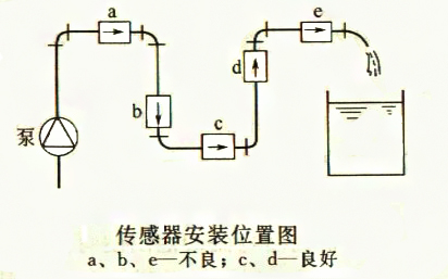 傳感器安裝方向水平、垂直或傾斜均可,不受限制。但測量固液兩相流體*好垂直安裝,自下而上流動。這樣能避免水平安裝時襯里下半部局部磨損嚴重,低流速時固相沉淀等缺點。 水平安裝時要使電極軸線平行于地平線,不要處于垂直于地平線,因為處于地步的電極易被沉積物覆蓋,頂部電極易被液體中偶存氣泡擦過遮住電極表面,使輸出信號波動。圖所示管系中c、d為適宜位置a、b 、e為不宜位置,b處可能液體不充滿a、e處易積聚氣體,且e處傳感器后管段短也有可能不充滿,排放口*好如f形狀所示。對于固液兩相流c處亦是不宜位置。