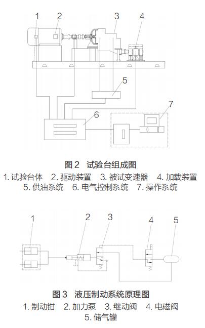 變速器超越離合器可靠性試驗(yàn)臺(tái)主要由試驗(yàn)臺(tái)體 1(試驗(yàn)平臺(tái)、驅(qū)動(dòng)電機(jī)支座、前支座、后支座)、驅(qū)動(dòng)裝置 2(驅(qū)動(dòng)電機(jī)、聯(lián)軸器)、被試變速器 3、加載裝置 4(液壓制動(dòng)系統(tǒng))、供油系統(tǒng) 5、電氣控制系統(tǒng) 6、